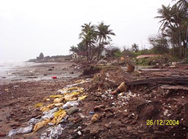 Dette billede af den tidligere fiskelandsby er foreviget af en lokal beboer i Tranquebar kort efter flodbølgen. Billedet er taget hen mod Guldsmedsgade. Husene forsvandt i havet. Alt "skramlet", som se på stranden, er ting skyllet med ud, da flodbølge nummer to trak sig tilbage.